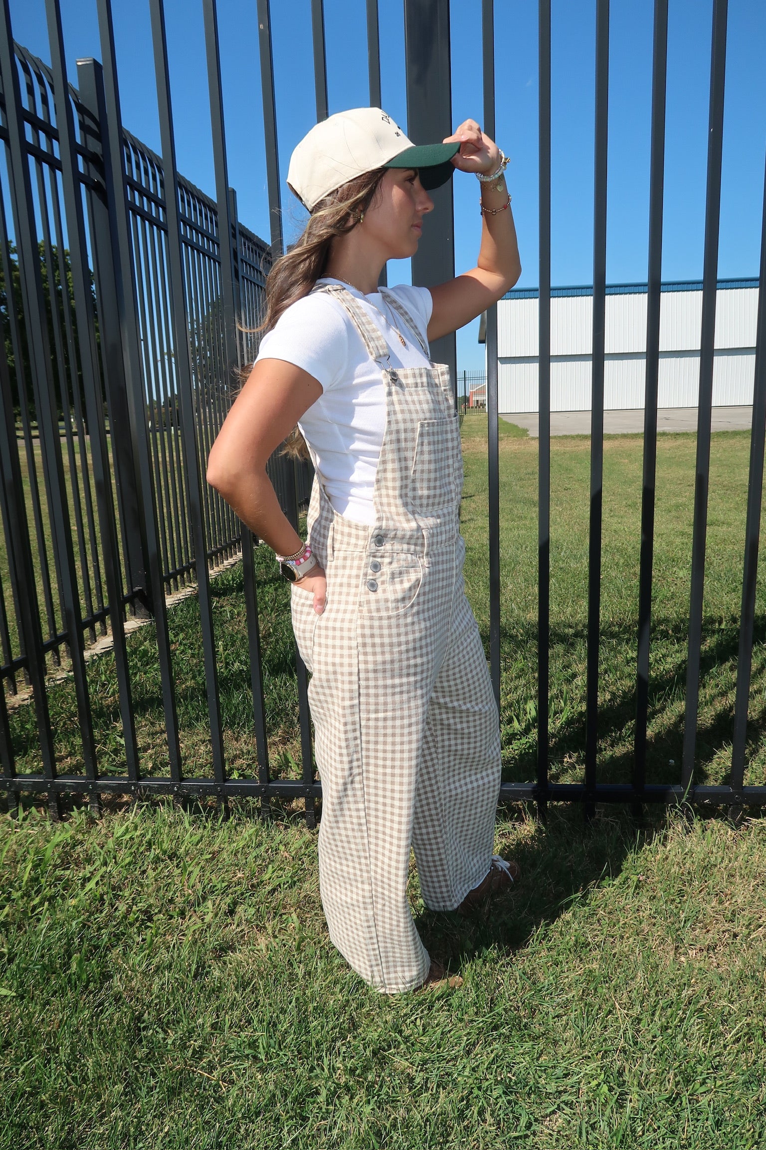 gingham denim overalls